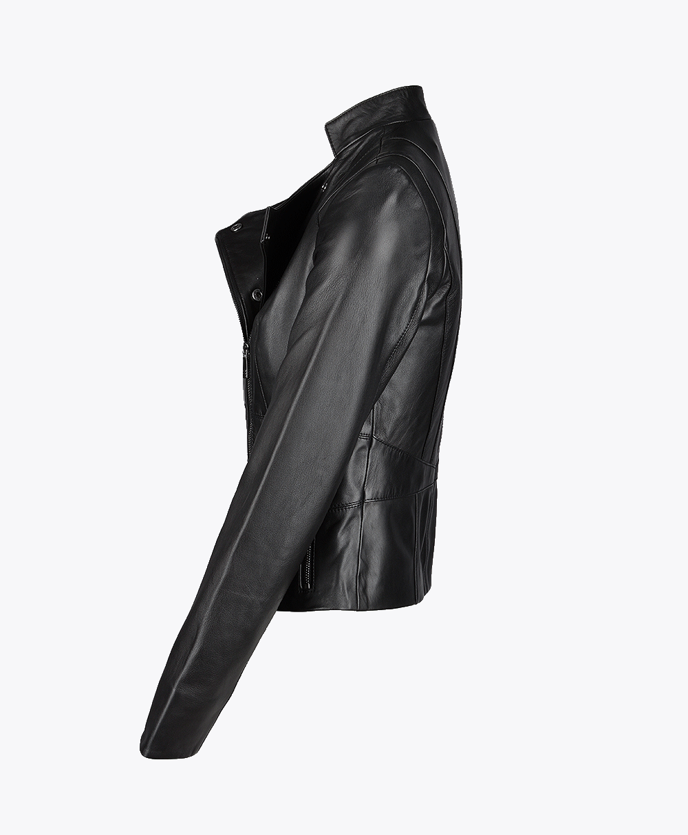Women’s Leather Biker Jacket Black Hanover from Vogue Jacket is a must have wardrobe piece. Handcrafted modern black biker in beautiful vegetable tanned eco friendly leather. With its simple clean lines, biker detailing, timeless styling and silhouette finish. The biker style has been around for just under a century and it’s here to stay. An iconic symbol of rebellious attitude that has seen its influence at different times over the years.