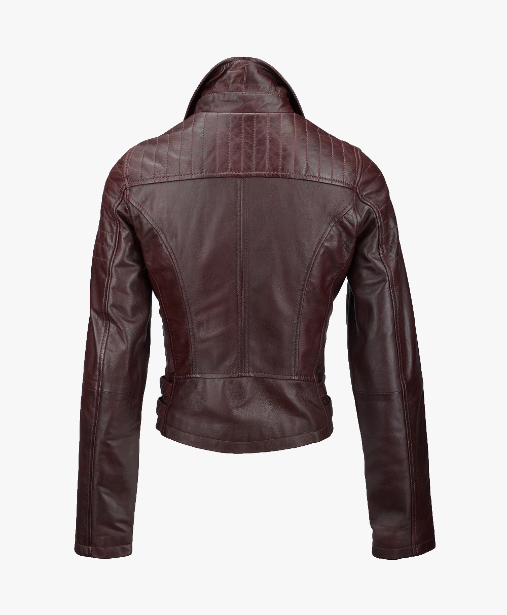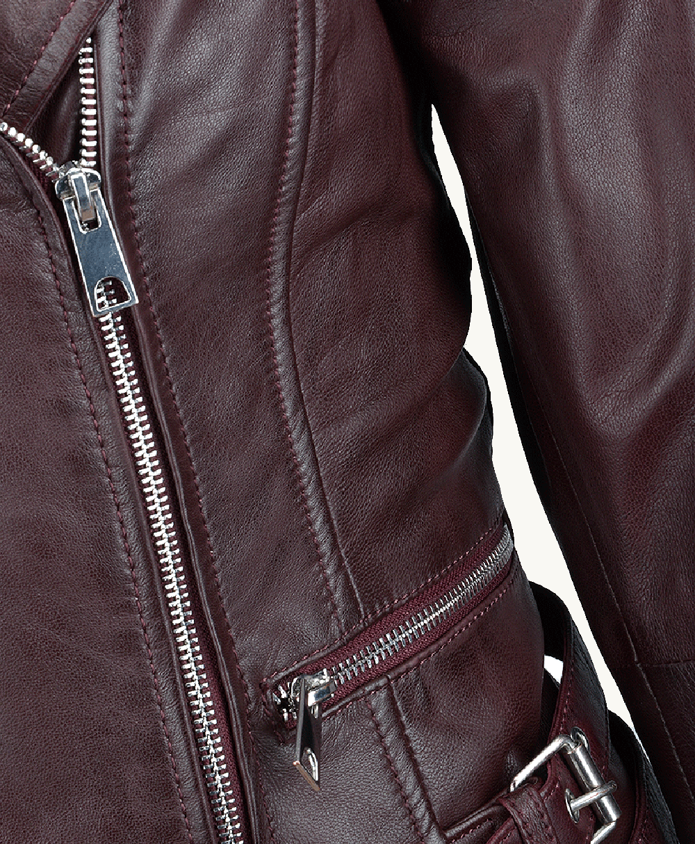 Complete any inspiring look with Women’s Leather Biker Jacket Burgundy Ottawa from Vogue Jacket. Colored in a wash and hand waxed effect to give a vintage biker look. Crafted with intricate seam detailing, couture biker styling and buttery soft leather. Wear open to allow the leather lapels to fall in to a smart biker style. Further distressing to the to edges of the pocket enhance the jackets worn in, authentic appeal.