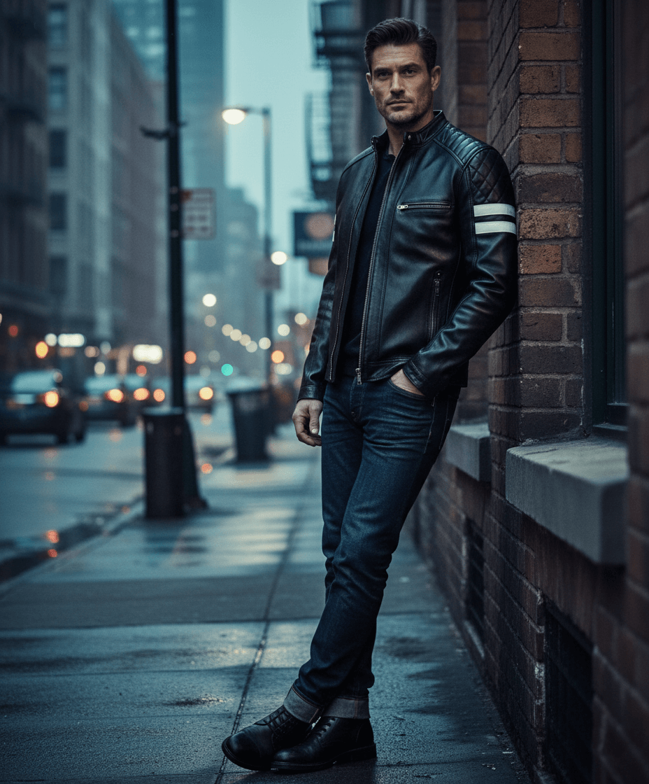Crafted from premium full grain genuine leather, the Leather Biker Jacket with Bold Contrasting Stripe Black Casper is engineered for performance and longevity. The breathable inner lining provides comfort in changing weather, while the asymmetrical zip up front, snap down collar, and zippered cuffs complete the timeless biker silhouette. The bold contrasting stripe adds a modern twist, giving it a fast, fearless vibe. Functional pockets on the front and inside offer convenience without sacrificing sleek style. Whether you’re riding through downtown or coasting down open roads, this jacket has your back in every season.