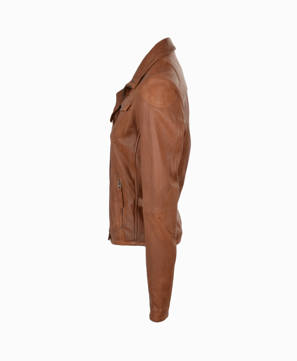 Women’s Leather Jacket Tan Windsor from Vogue Jacket exudes elegance and confidence. Handmade with tasteful sophistication with two side pockets, two chest pockets and zip fastening which can be fastened to neck or zipped down for a relaxed collar look crafted from quality graded nappa leather. Comes in the classic smooth black, or the vintage wash and hand waxed effect found in the tan. The biker style has been around for just under a century and its here to stay. An iconic symbol of rebellious attitude that has seen its influence at different times over the years.