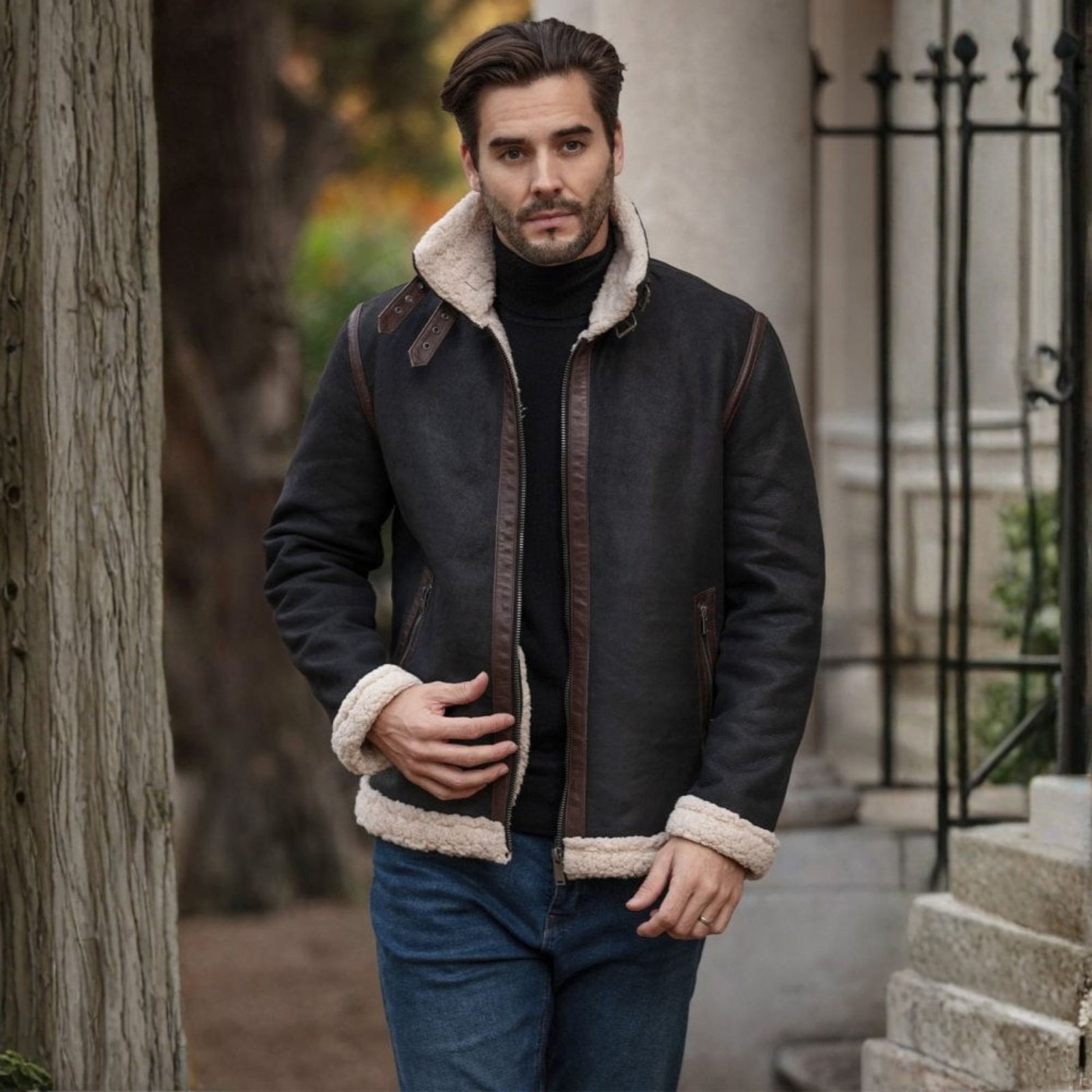Crafted from real suede leather, the exterior offers a rich texture and refined finish. Inside, the faux fur lining delivers exceptional warmth and comfort, ideal for colder climates. The fur lined collar with dual buckle straps not only enhances insulation but also adds a distinctive, masculine edge to the overall design.