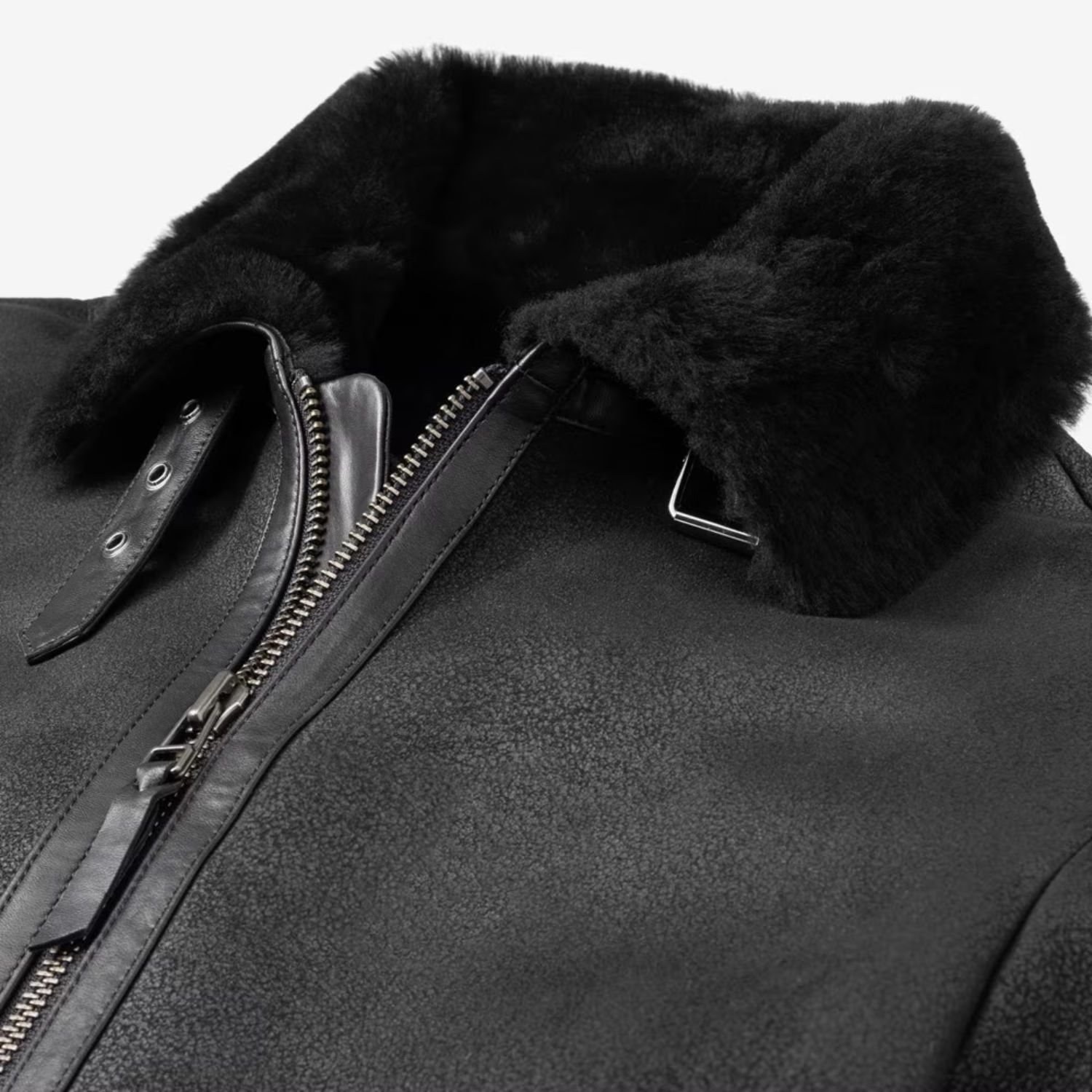 Experience timeless winter luxury with the Men’s Shearling Bomber Black Leather Jacket, a masterpiece crafted for warmth, durability, and standout style. Designed with authentic bomber heritage, this jacket features a throat latch with buckle, giving it a bold, classic, aviation inspired look.