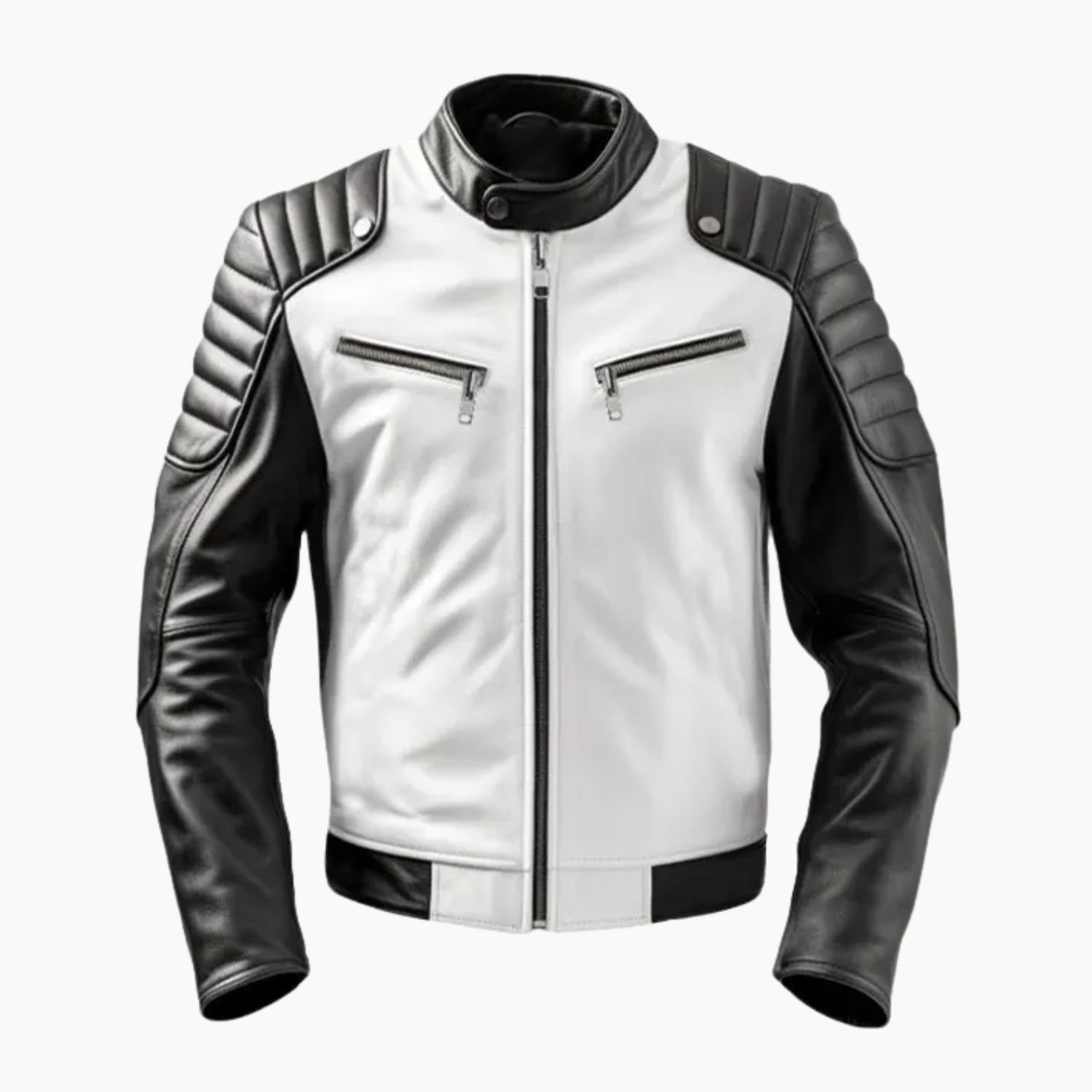 Rev up your style with the Men’s Sportage Black & White Café Racer Leather Jacket by Vogue Jacket crafted from 100% real sheepskin leather for a premium feel and long-lasting durability. Designed for riders and trendsetters, this jacket brings together classic racing aesthetics and modern streetwear appeal.