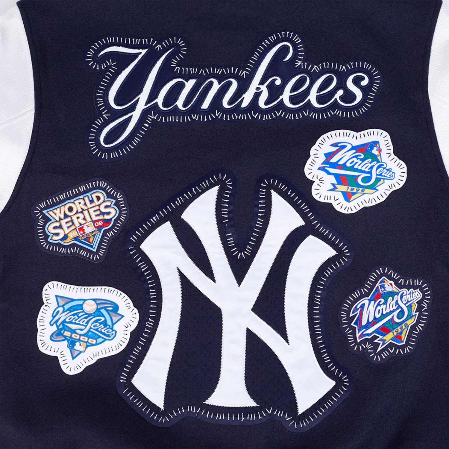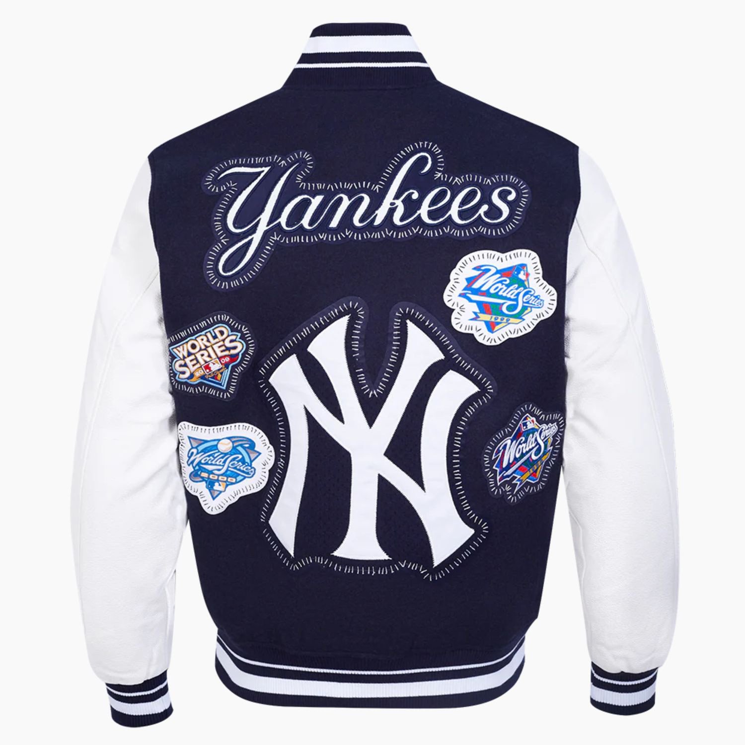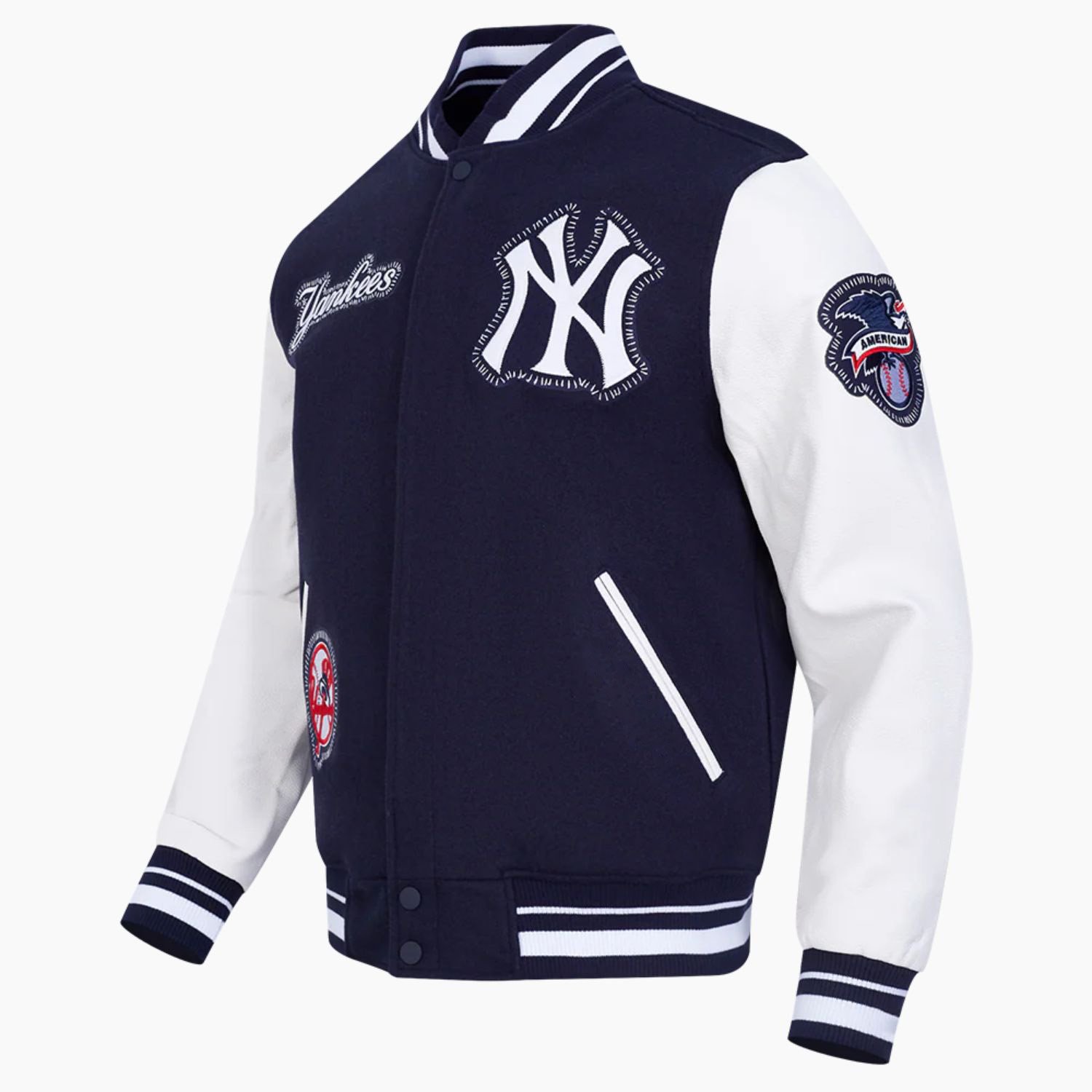 Built with a high-quality wool body and durable leather sleeves, this New York Yankees varsity jacket ensures lasting warmth, comfort, and style. The rib-knit collar, cuffs, and waistband deliver a snug fit, while the DIY pick stitch detailing adds a bold, handcrafted finish. Featuring the official Yankees logo on the chest, this jacket lets you represent your favorite MLB team with pride.