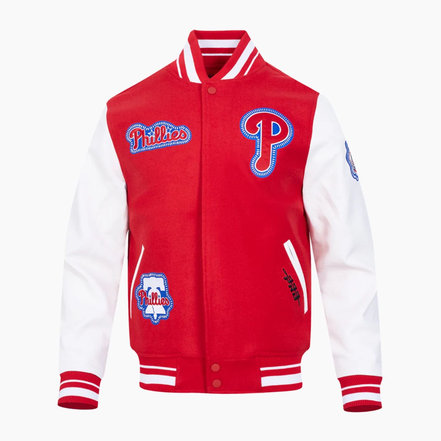 Crafted with a high-quality wool body and durable leather sleeves, this Philadelphia Phillies varsity jacket provides lasting warmth and comfort. The rib-knit collar, cuffs, and hem deliver a secure fit, while the DIY pick stitch detailing adds a unique, hand-finished touch. The official Phillies logo on the chest proudly represents your favorite MLB team in bold fashion.