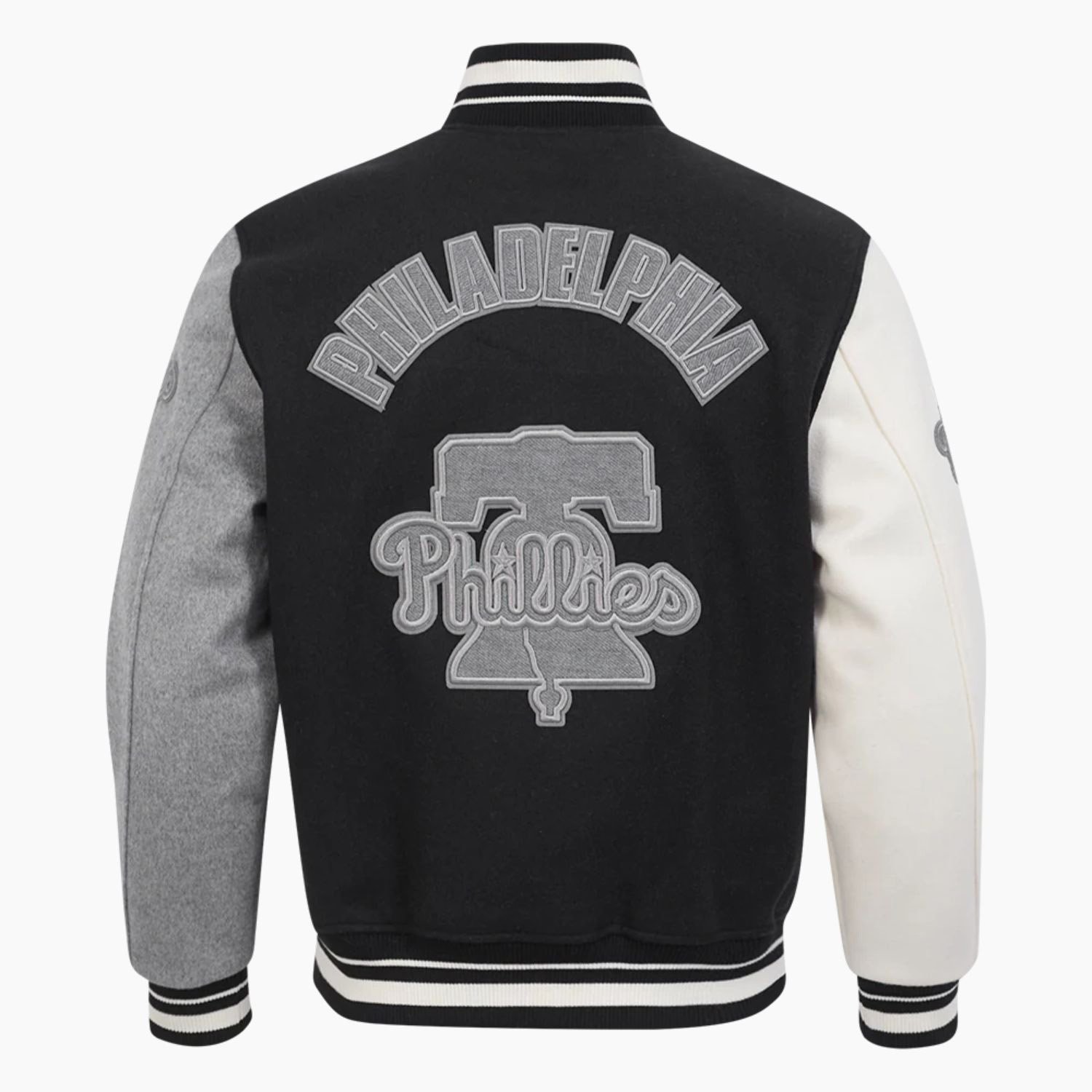 Crafted for durability and comfort, this Philadelphia Phillies varsity jacket features a wool body that keeps you warm, while the rib-knit collar, cuffs, and hem ensure a secure fit. The snap-button front allows for easy layering, and the official Phillies logo on the chest proudly displays your team pride wherever you go.