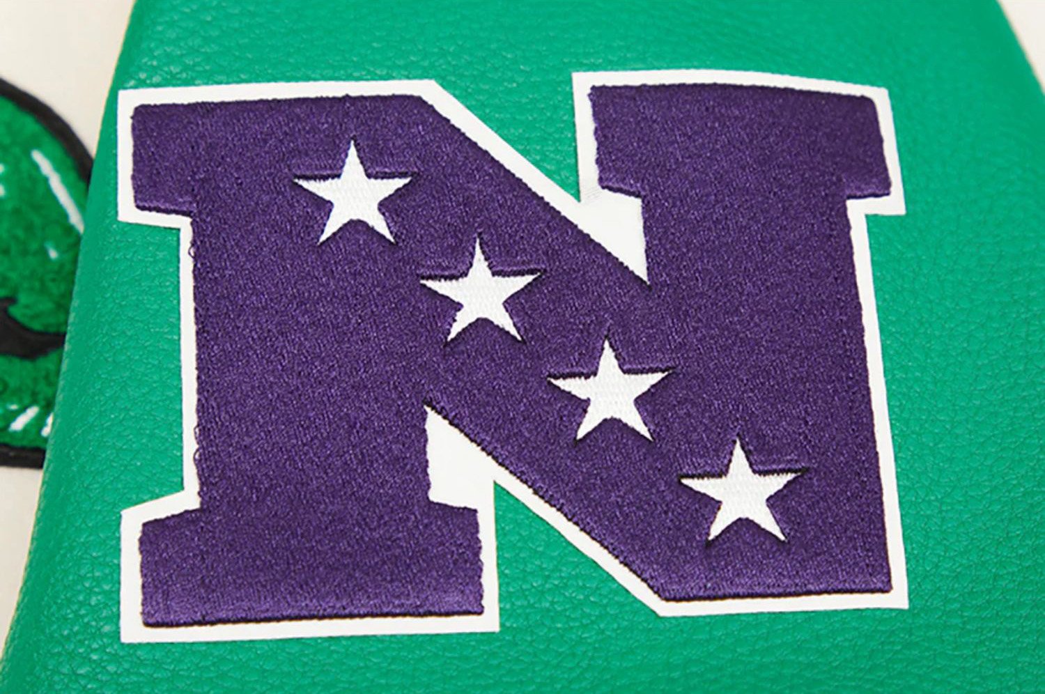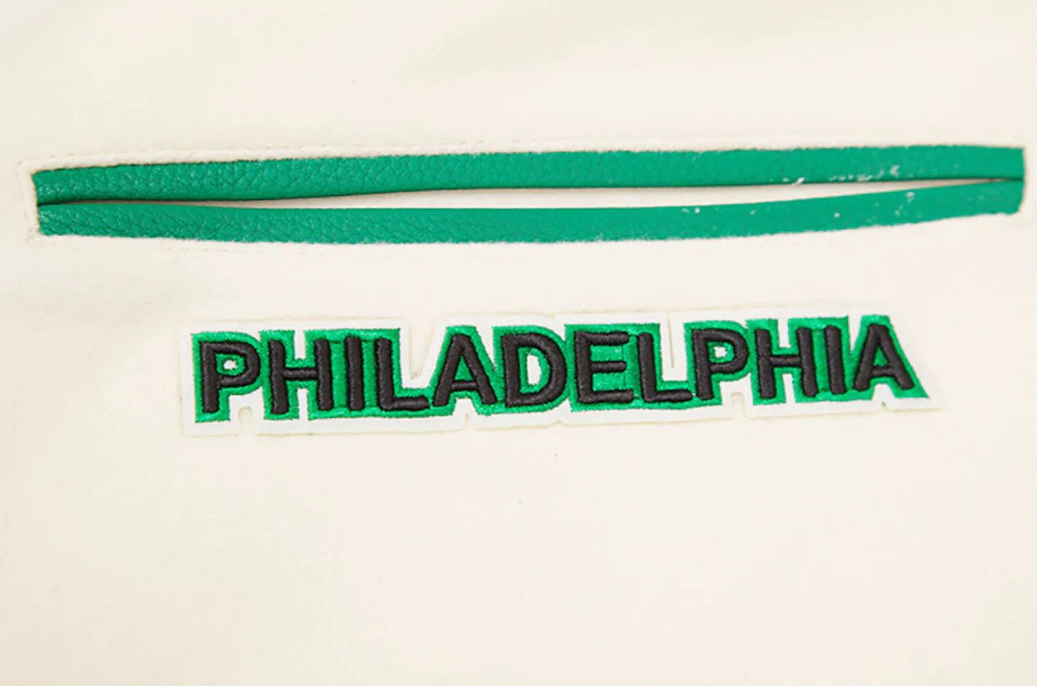 Crafted from premium wool fabric with soft leather sleeves, it provides the perfect balance of durability and comfort. The rib knit collar, cuffs, and hemline ensure a snug fit, while the soft inner viscose lining keeps you warm during chilly days. Featuring the official Philadelphia Eagles logo, this jacket proudly represents your favorite NFL team with a vintage, all American feel.