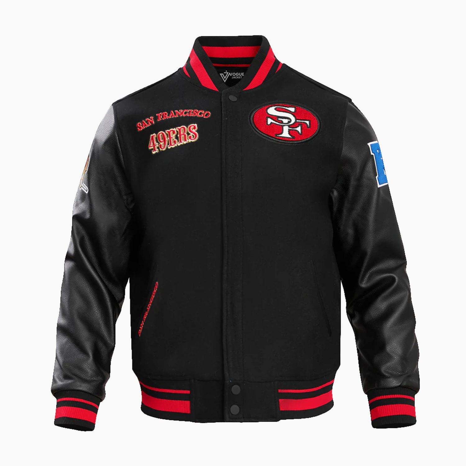 Step up your game-day style with the NFL San Francisco 49ers Retro Classic Men’s Rib Wool Varsity Jacket Black by Vogue Jacket a timeless piece for every true 49ers fan. Designed with premium wool blend fabric and genuine leather sleeves, this jacket brings together comfort, warmth, and the perfect retro vibe.