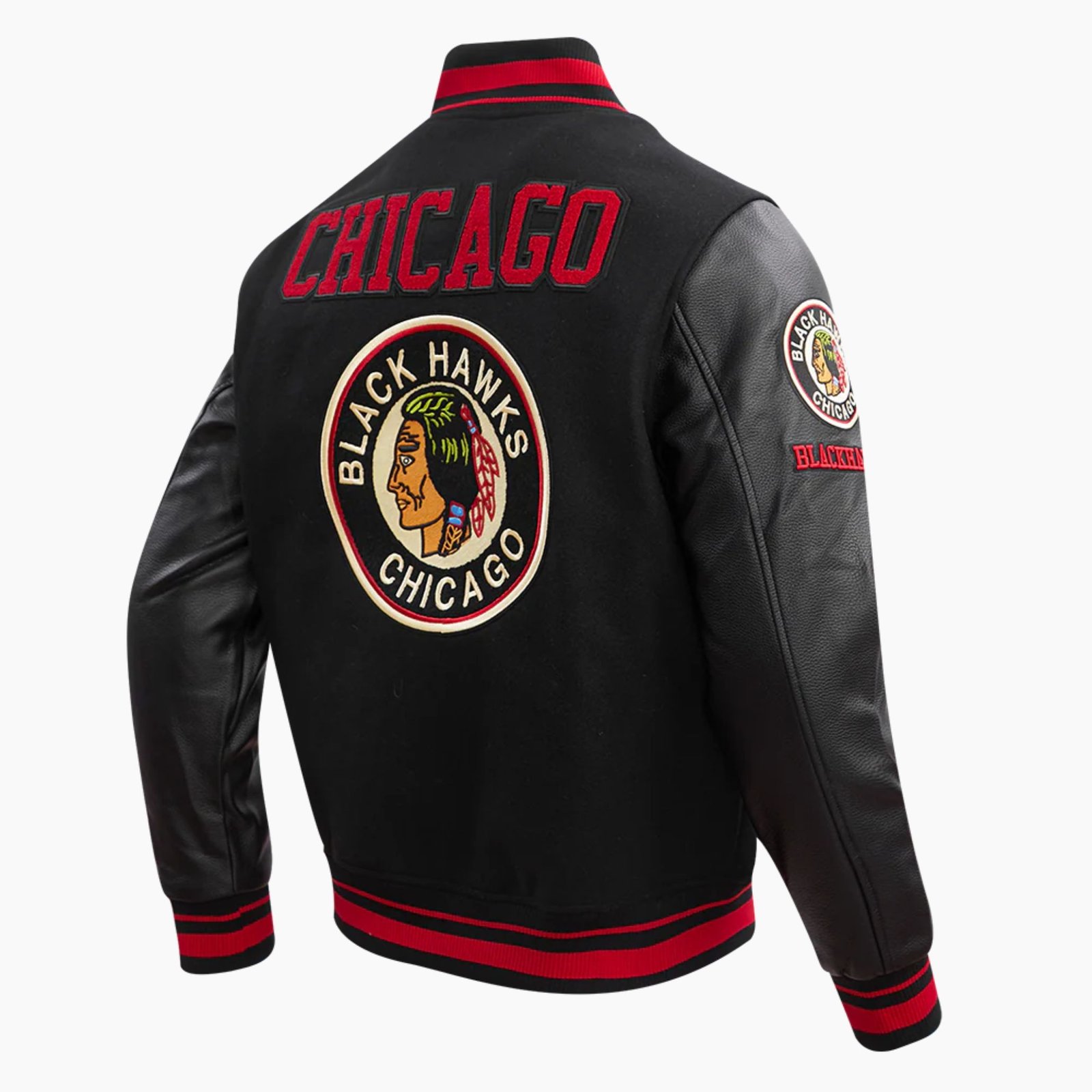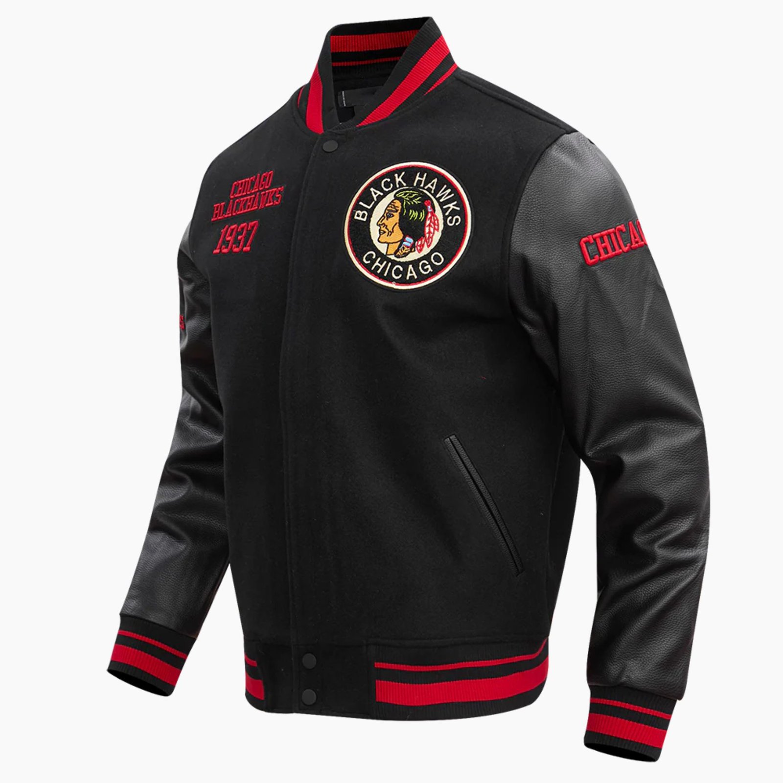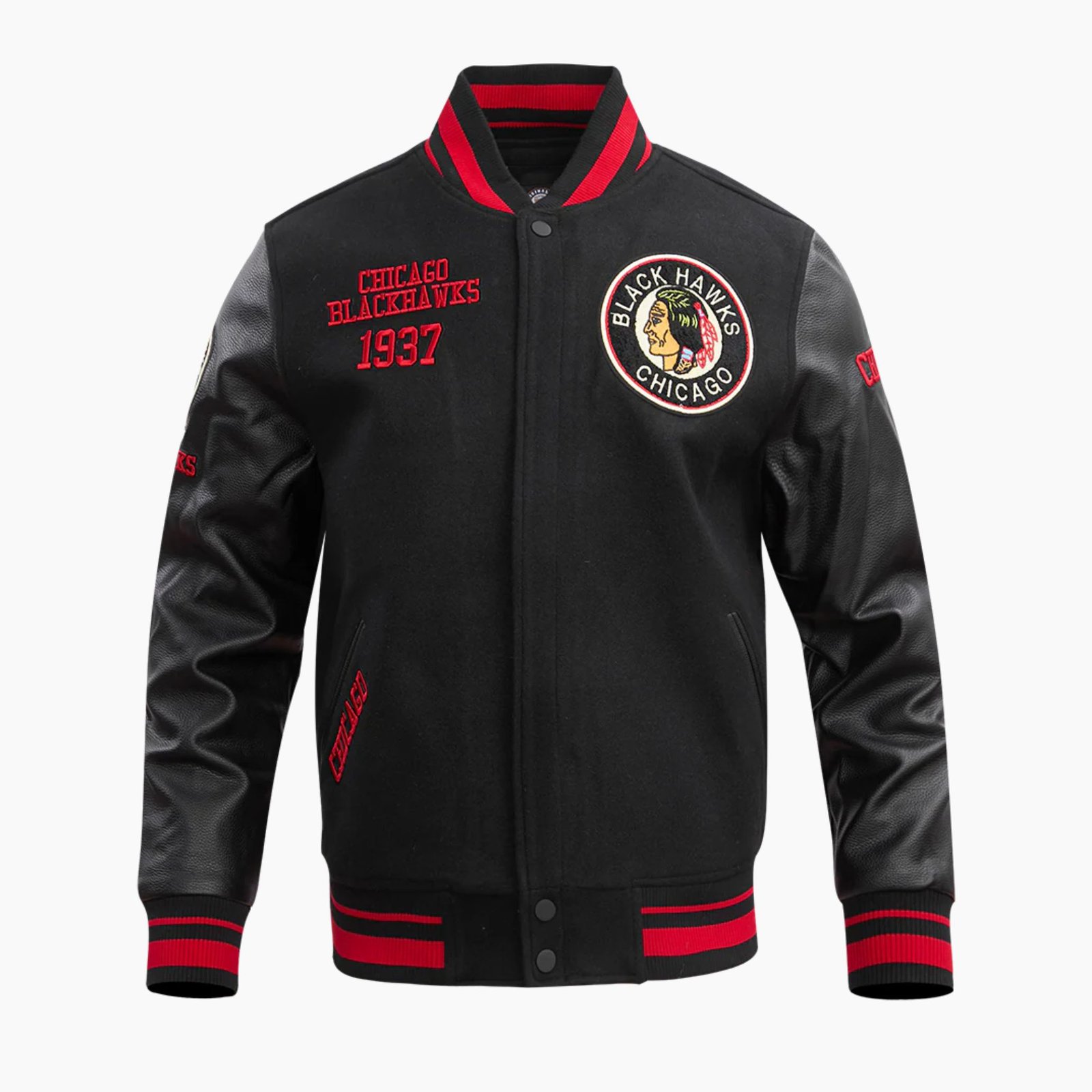 Striped rib knit collar cuffs and hem create a classic finish and help retain warmth while enhancing the overall fit. This Chicago Blackhawks varsity jacket by Vogue Jacket also includes two functional front pockets for convenience and everyday practicality. The traditional DTF sticker detail and mashup design inspired by the iconic Chicago Blackhawks logo bring a unique twist that fans will love.