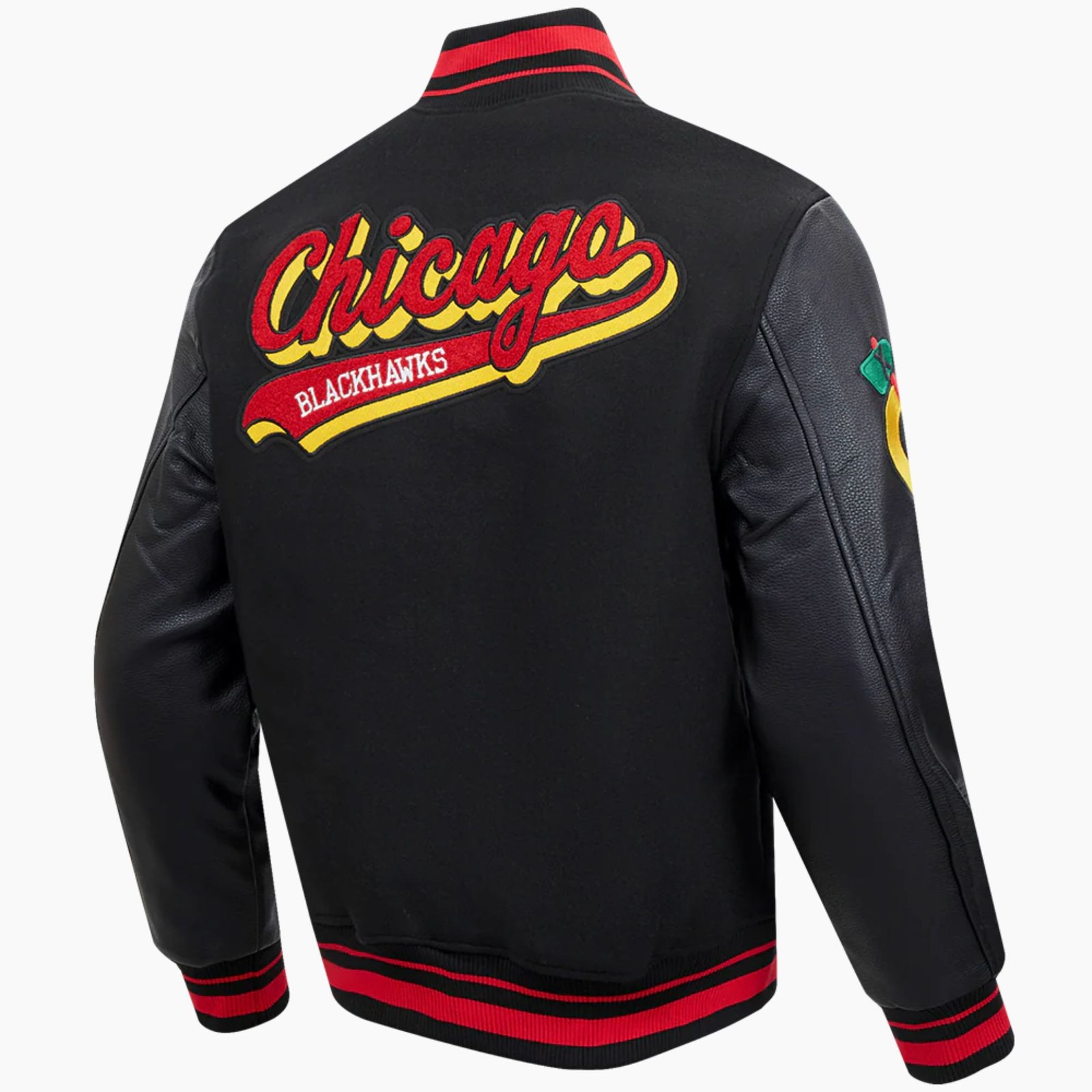The NHL Chicago Black Blackhawks Script Tail Men’s Rib Wool Varsity Jacket is a premium outerwear choice for fans who love classic sports styling with modern comfort. Designed with a warm wool body and genuine leather sleeves, this varsity jacket delivers a durable and stylish look that stands out in any crowd. The long sleeves offer comfortable coverage which makes it a great pick for cool weather and game day outfits.