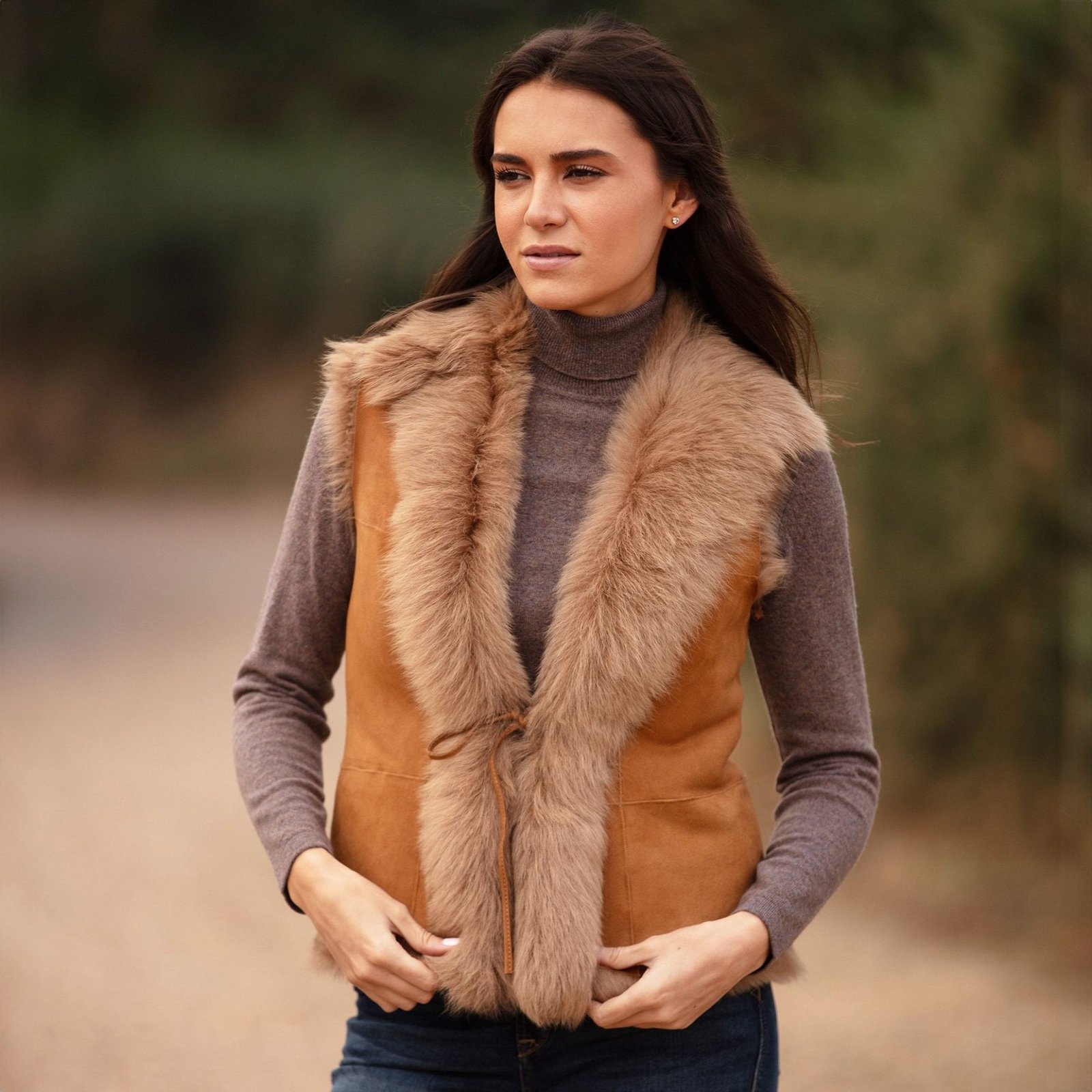 Step into timeless elegance with the Toscana Suede Leather Gilet in Honey from Vogue Jacket a luxurious layering essential designed for effortless sophistication. Crafted from 100% genuine Toscana shearling, this premium gilet features a beautifully hand buffed suede finish that enhances the natural richness of the honey color.