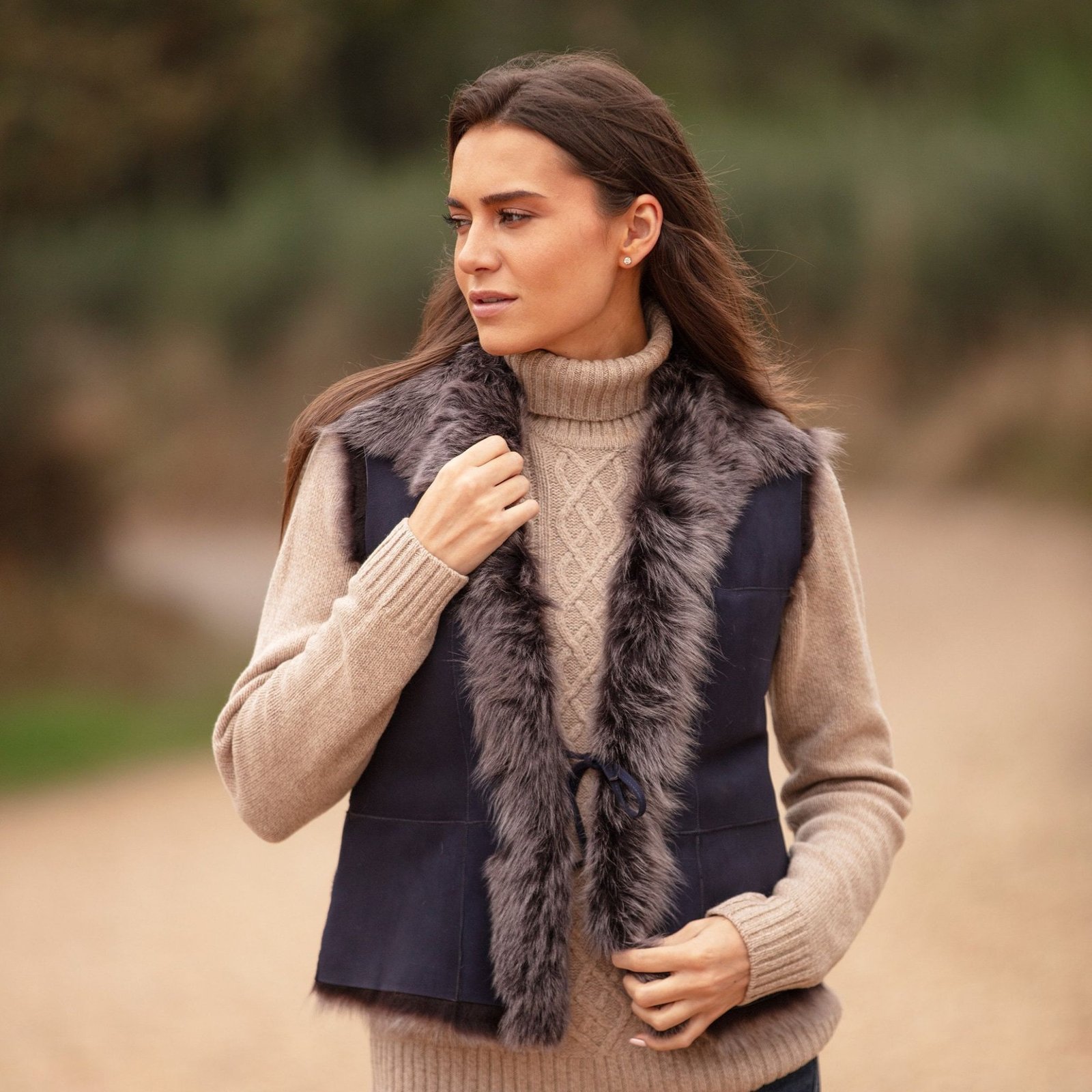Upgrade your winter layering with the Reversible Toscana Suede Leather Gilet in Navy from Vogue Jacket a premium shearling essential crafted for women who love versatility, luxury, and timeless style. Made from 100% genuine Toscana shearling with a beautifully hand buffed suede finish, this gilet offers two different looks in one wear the suede side for a sophisticated matte finish or reverse it to showcase the luxurious shearling for a warm, plush feel.