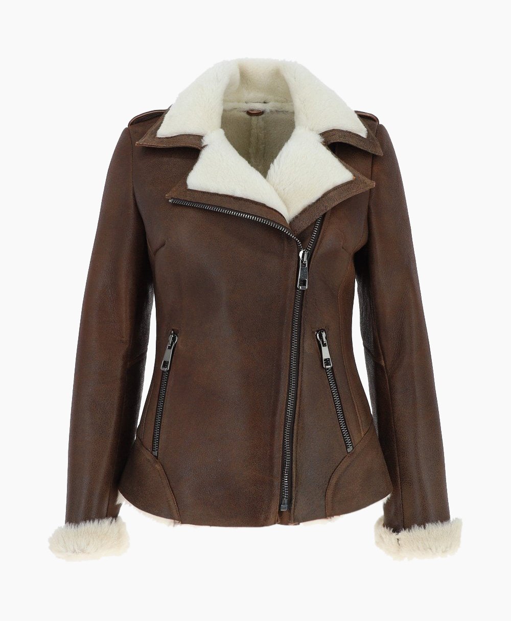 Women’s Shearling Leather Jacket Brown Alexander fitted authentic curvaceous sultry cut of the classic women sheepskin aviator jacket in brown from Vogue Jacket is a real crowd pleaser. Fashioned in a soft luxury smooth tailored cut with vintage rough edge finishes. A real feminine jacket with a strong spotlight on luxury shearling leather.
