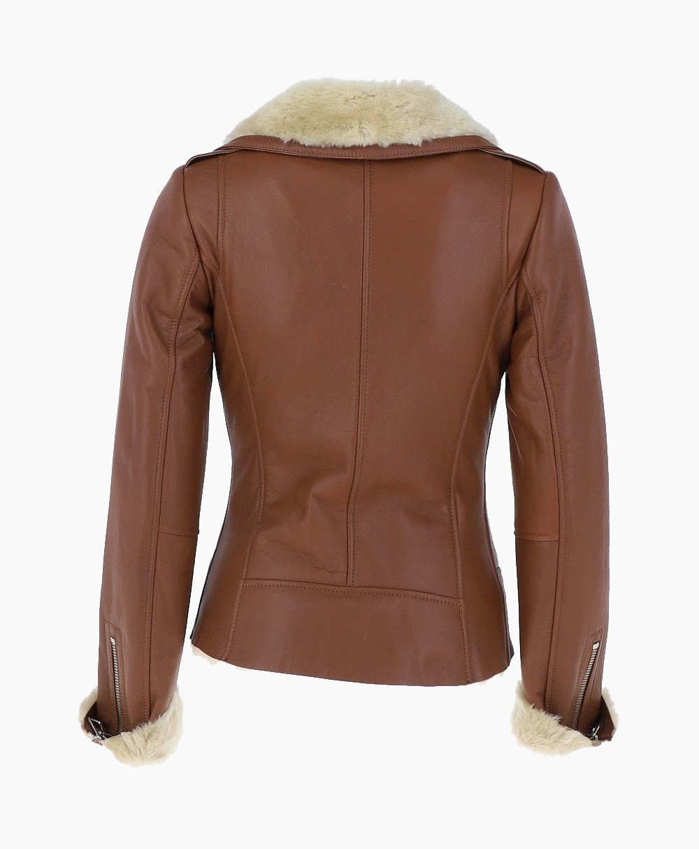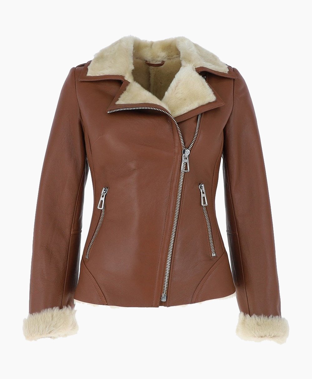 Women’s Shearling Leather Jacket Tan Alexander fitted authentic curvaceous sultry cut of the classic women sheepskin aviator jacket in tan from Vogue Jacket is a real crowd pleaser. Fashioned in a soft luxury smooth tailored cut with vintage rough edge finishes. A real feminine jacket with a strong spotlight on luxury shearling leather.
