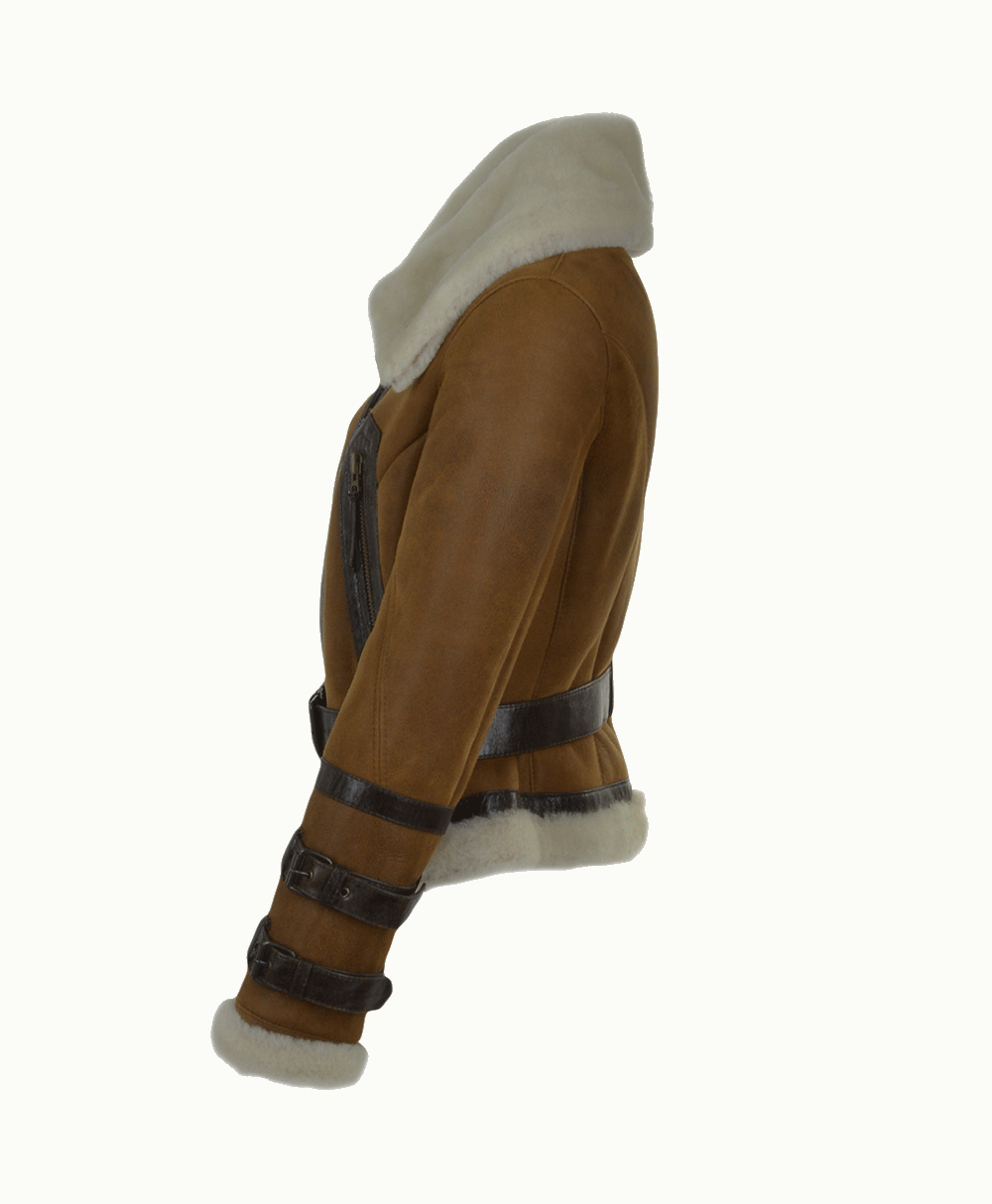 Women’s Sheepskin Aviator Jacket Tan Aberdeen from Vogue Jacket takes on the authentic look of classic wartime pieces with a modern fashion glam chic twist. Expertly constructed sourcing only the best grades of sheepskin leather. Tackle the sharp temperatures with this classic chic outerwear style.